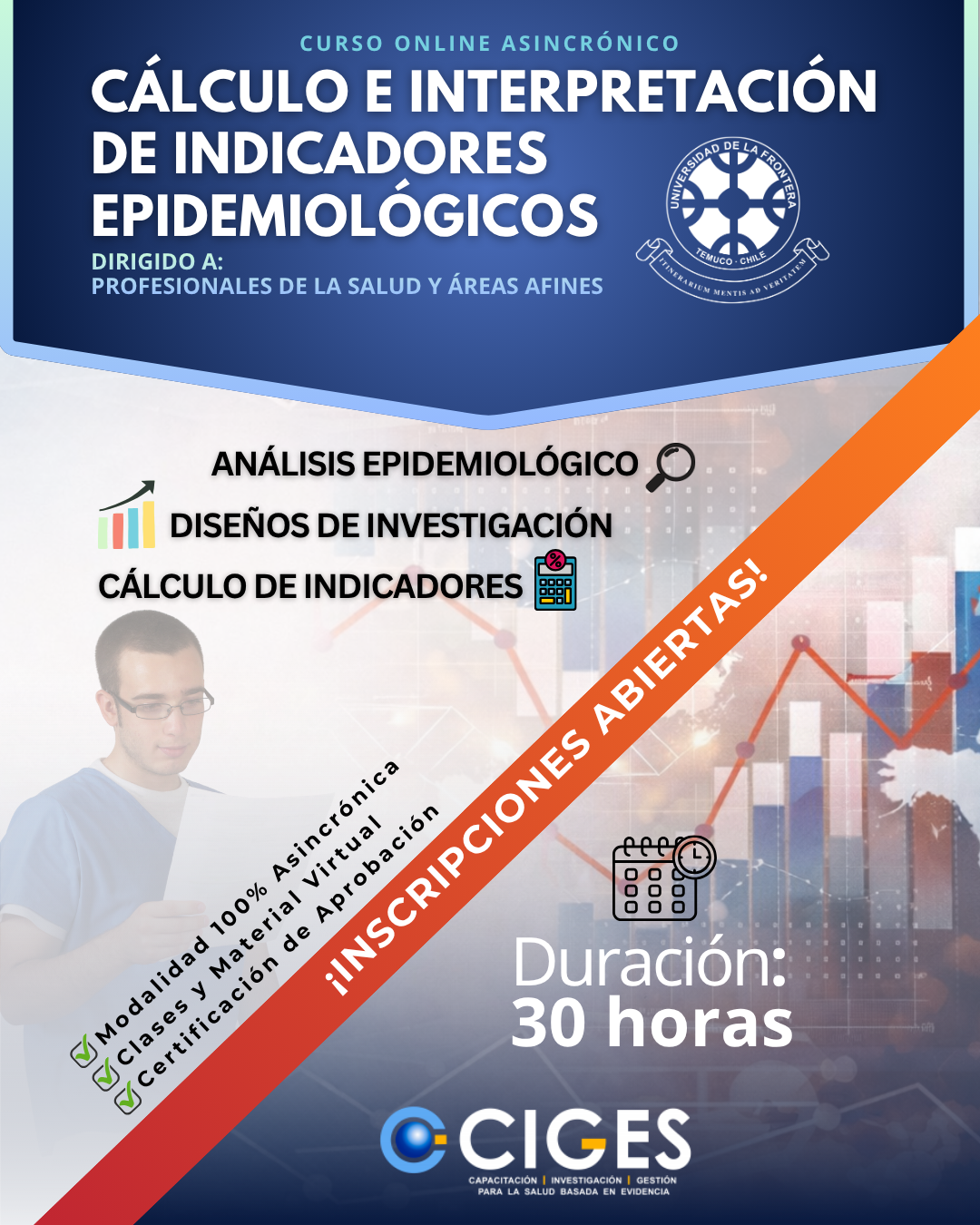 Este curso entrega herramientas fundamentales para el cálculo, interpretación y aplicación de indicadores epidemiológicos, junto con una introducción a los principales diseños de estudios epidemiológicos, fortaleciendo la capacidad de los profesionales de la salud para interpretar literatura científica y tomar decisiones basadas en evidencia.